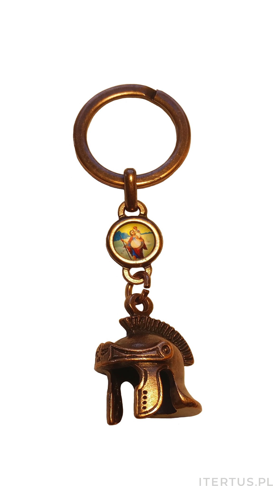 Brelok do kluczy św. Krzysztofa w formie hełmu centuriona rzymskiego