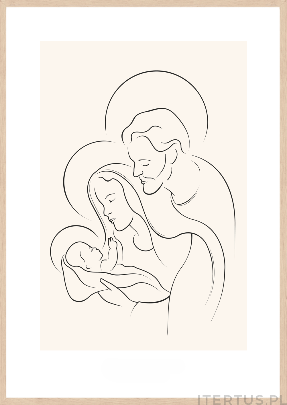 Projekt opiera się na subtelnej, czarnej linii kreślącej wizerunek Świętej Rodziny na łagodnym, beżowym tle. Dzięki formatowi A2, dekoracja jest wyraźna i staje się centralnym punktem pokoju dziecięcego, wprowadzając do niego harmonię. Dbamy o to, aby nasze produkty były bliskie naturze – dlatego grafikę oprawiliśmy w solidną ramę z naturalnego drewna sosnowego.