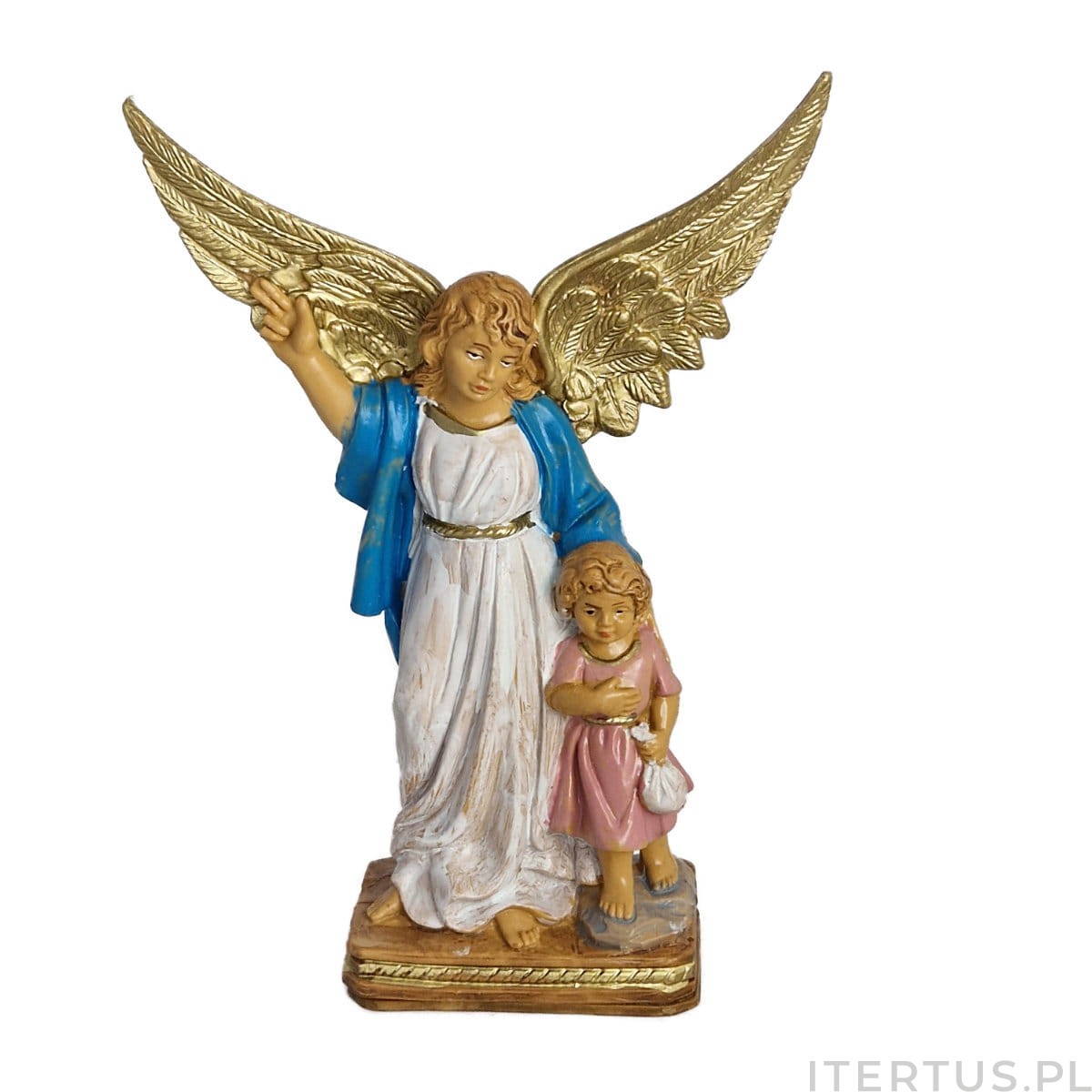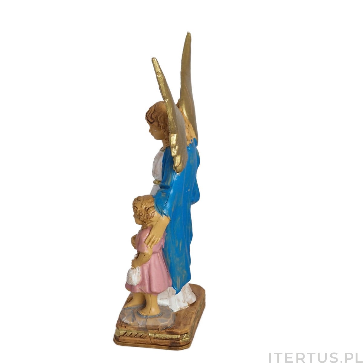 Figurka Anioła Stróża z dzieckiem to symbol opieki i bezpieczeństwa. Przedstawia anioła o złotych skrzydłach, który prowadzi małą dziewczynkę. Kolory są wyraźne i harmonijne. Anioł ma białą szatę z niebieskim płaszczem. Dziewczynka ubrana jest w różową sukienkę. Całość wygląda elegancko i przyciąga uwagę.