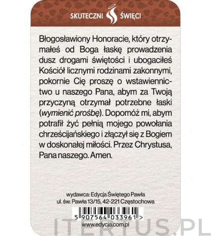 Na odwrocie znajduje się skuteczna modlitwa, dzięki której możesz codziennie powierzać swoje troski bł. Honoratowi Koźmińskiemu i prosić o jego wstawiennictwo.