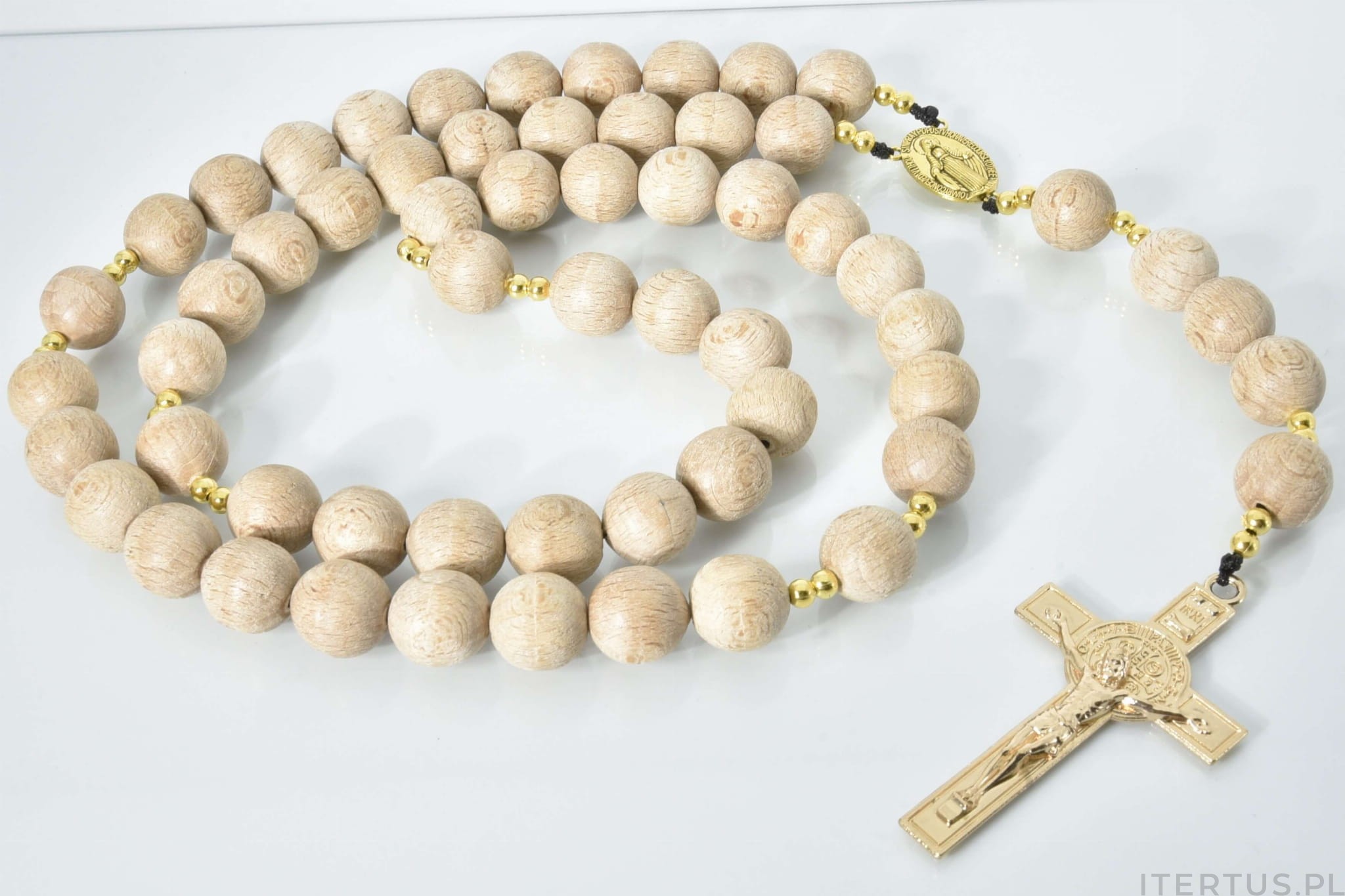 | Dodatkowe informacje | Elementy różańca - Krzyżyk złoty świętego Benedykta, medalik złoty Matki Bożej Niepokalanej, koraliki z wytrzymałego tworzywa złotego pomiędzy drewnianymi koralikami |