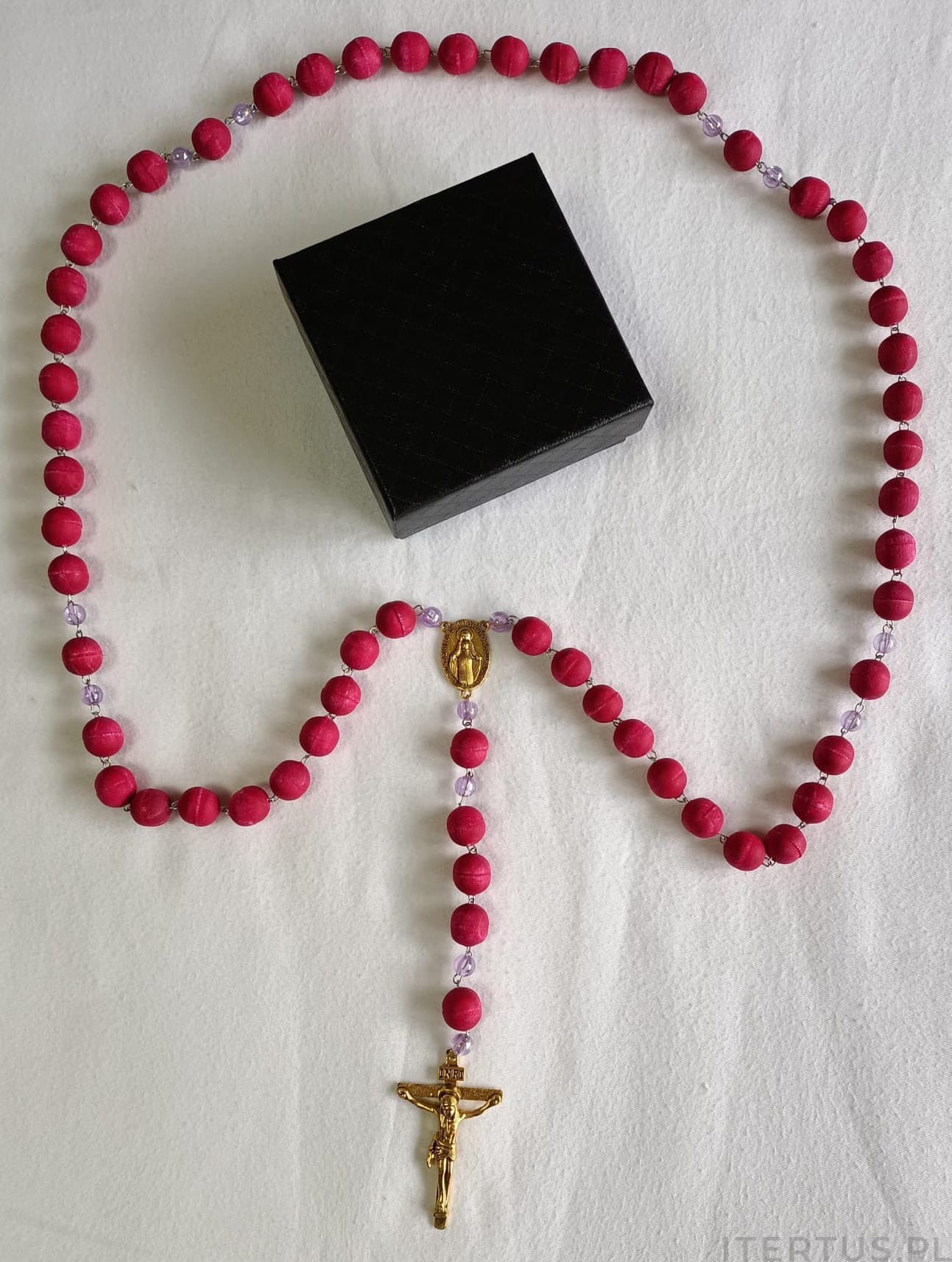 Przedstawiamy wyjątkowy różaniec, który zachwyca swoją elegancją i starannością wykonania. Każdy koralik o średnicy 10 mm został ręcznie wykonany z polskiego drewna, co nadaje mu niepowtarzalny charakter. Różowe koraliki w połączeniu ze złotym krzyżem oraz medalikiem Matki Bożej Niepokalanej tworzą harmonijną całość, która z pewnością przyciągnie wzrok i doda uroku każdej modlitwie. Dodatkowe elementy w kolorze fioletowym wprowadzają subtelny akcent, który podkreśla wyjątkowość tego różańca.