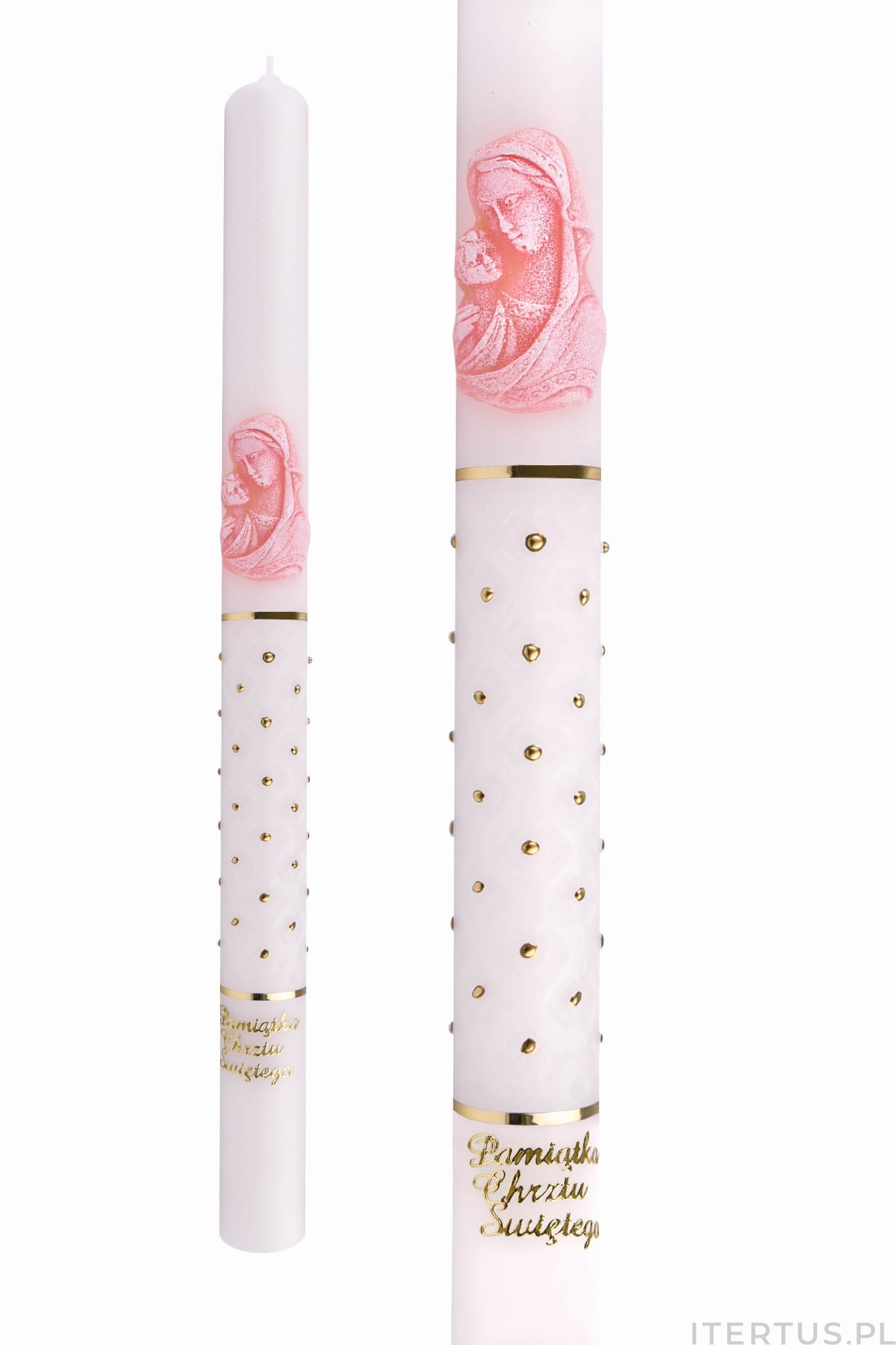 Świeca do chrztu z różową aplikacją - Matka Boża rzeźbiona