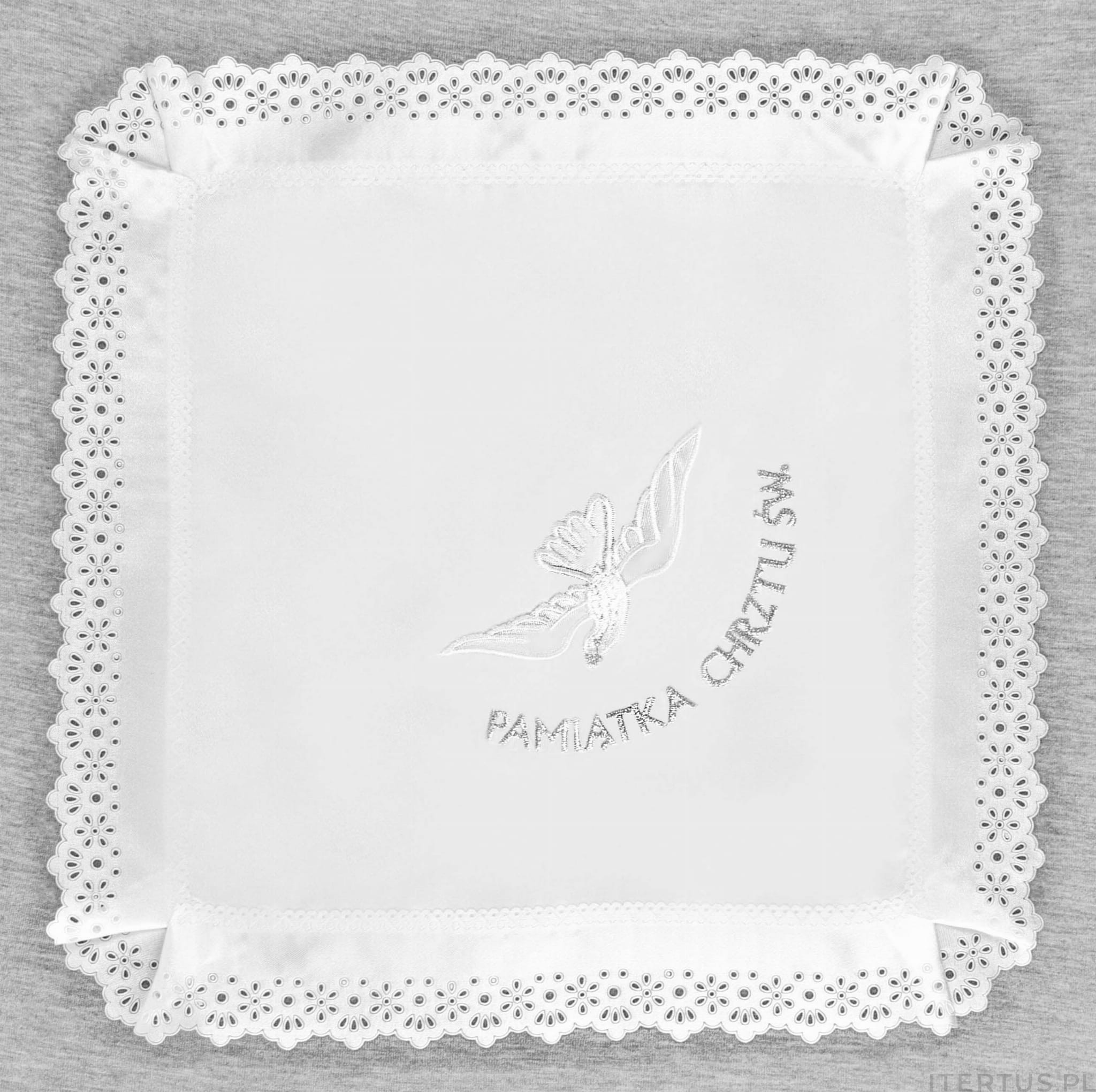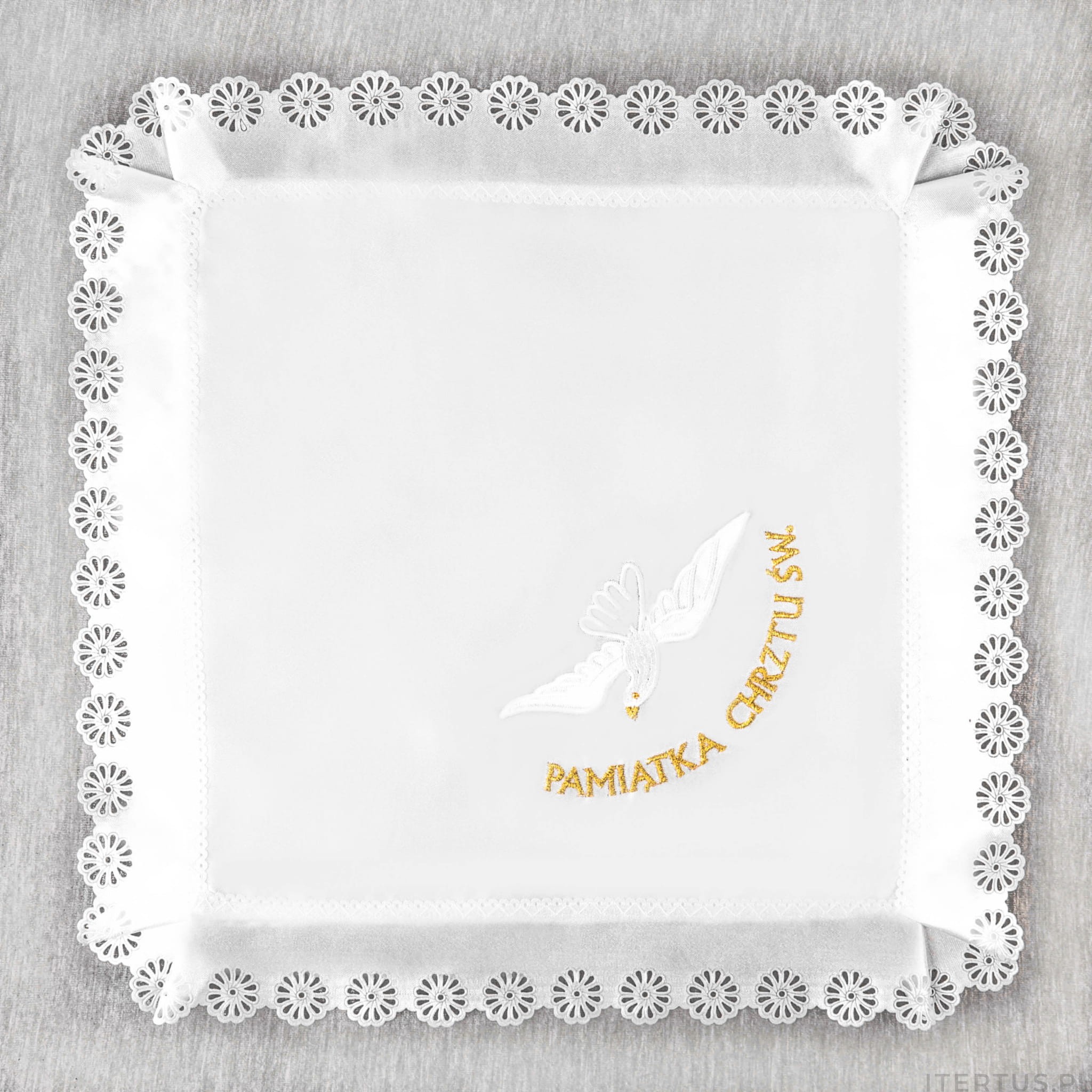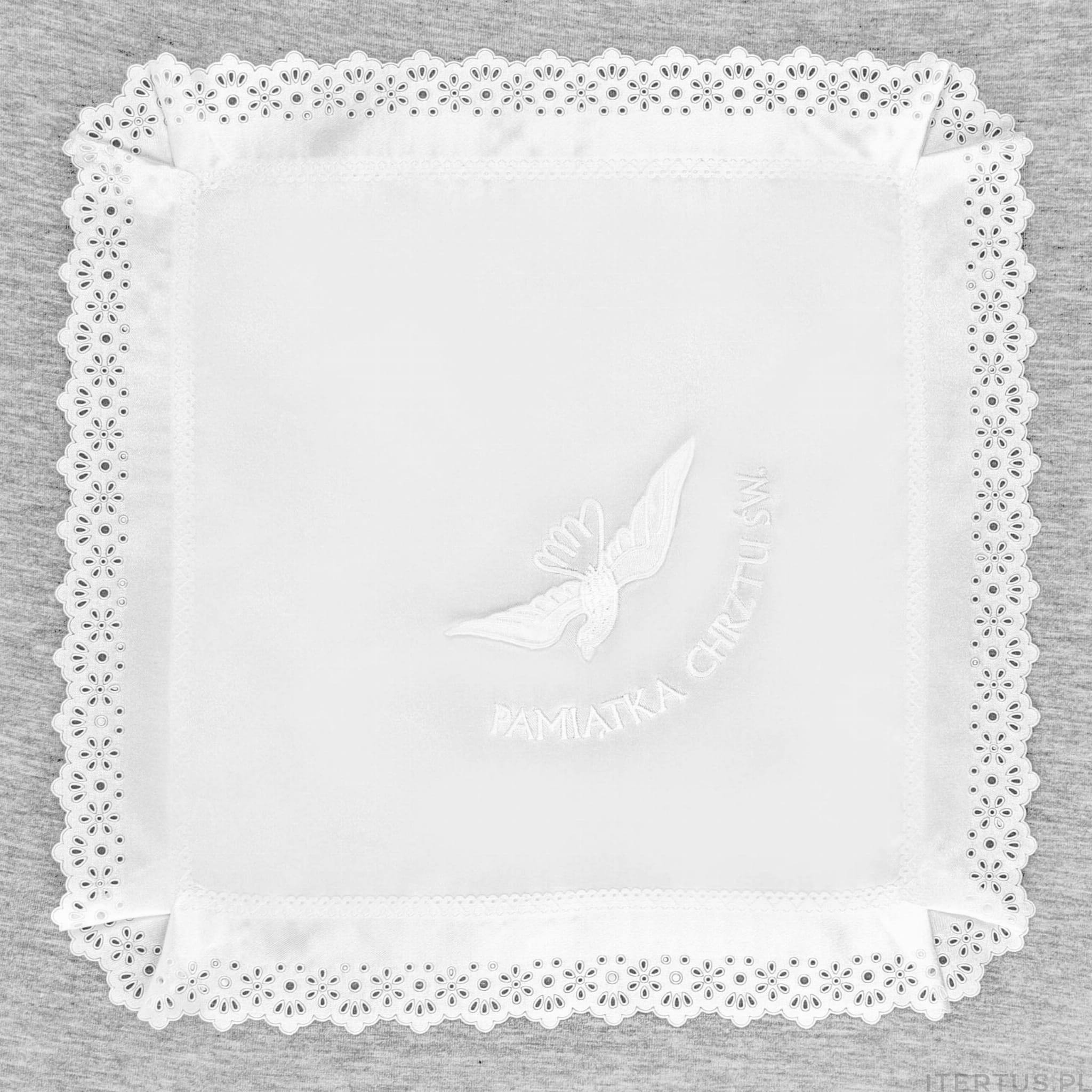 Szatka do chrztu z nadrukiem gołębicy przygotowana specjalnie na uroczystość przyjęcia chrztu świętego. Ta piękna chusteczka jest dostępna w kilku wariantach kolorystycznych, co pozwala dopasować ją do indywidualnych preferencji. Wykonana w formie kwadratowej chusteczki, została obszyta delikatną koronką, dodającą jej elegancji i uroku.