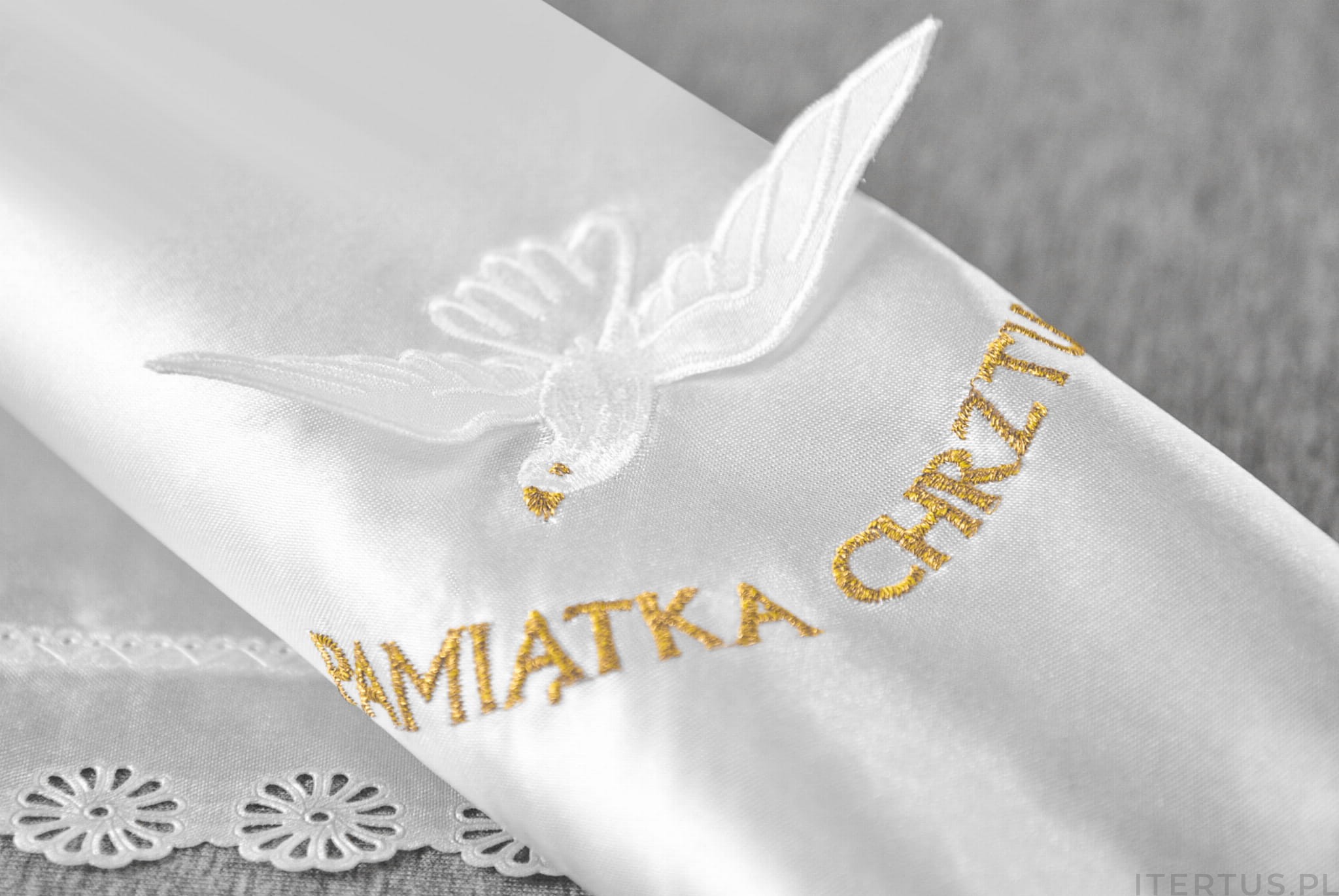 Szatka do chrztu z haftowaną aplikacją w formie gołębic, dostępna w różnych kolorach