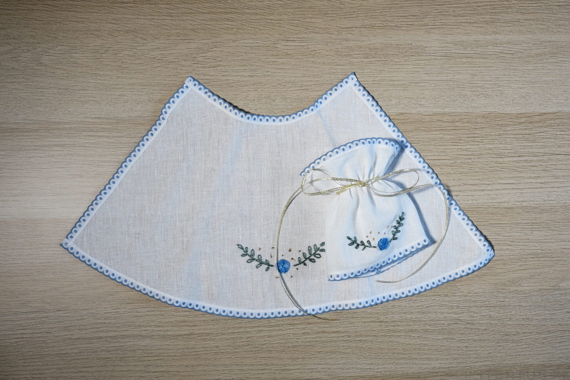 Komplet do Chrztu dla Chłopca - Szatka i Profitka do świecy chrzcielnej - Haft Angielski Niebieski Handmade - unikat